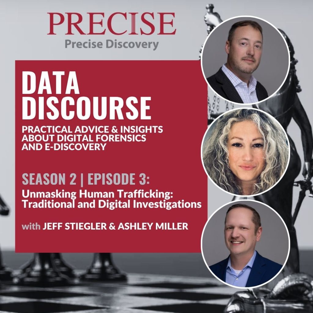 In this powerful episode* of Data Discourse, host Pete Mansmann is joined by Jeff Stiegler of Precise Inc. and Ashley Miller of CSI Investigators for a deep conversation  into the hidden world of human trafficking and the tools used to fight it. Throughout this episode, the trio unpack how this complex crime thrives in both